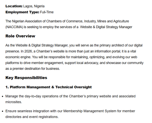 Greetings from the Nigerian Association of Chambers of Commerce, Industry, Mines and Agriculture (NACCIMA). We are delighted to announce the...